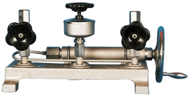 开启(或关闭)油杯阀门。旋转手轮使活塞移动,所产生之压力(或负压)随即传至两个压力表(或真空表),根据精密压力表的指示值对被检验压力表进行检验。