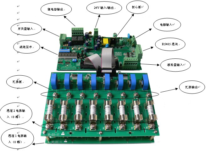 光伏汇流采集装置是专门应用于智能光伏汇流箱,用于监测光电池阵列中电池板运行状态,光电池电流测量,汇流箱中防雷器状态采集、直流断路器状态采集、继电器接点输出、带有风速、温度、辐照仪等传感器接口,装置带有RS485接口可以把测量和采集到的数据和设备状态上传。