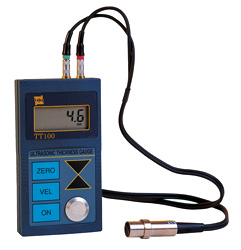 原理:超声波测厚仪根据超声波脉冲反射原理来进行厚度测量的,当探头发射的超声波脉冲通过被测物体到达材料分界面时,脉冲被反射回探头,通过精确测量超声波在材料中传播的时间来确定被测材料的厚度。时代超声波测量厚仪系列是集当代科技电子技术和测量技术于一体的、先进的无损检测仪器,采用微电脑对数据时行分析、处理、显示,采用高度优化的测量电路,具有测量精度高、范围宽、操作简便、工作稳定可靠等特点。凡能使超声波以一恒定速度在其内部传播的各种材料均可采用此原理测量。可以对各种板材和加工零件作精确测量,广泛应用于石油、化工、冶金、造船、航空、航天等各个领域。 TT100超声波测厚仪是TT100系列测厚仪的基本型,该仪器利用超声波原理可以对任何超声波良导体材料厚度进行测量,如金属类、塑料类、陶瓷类、玻璃类。