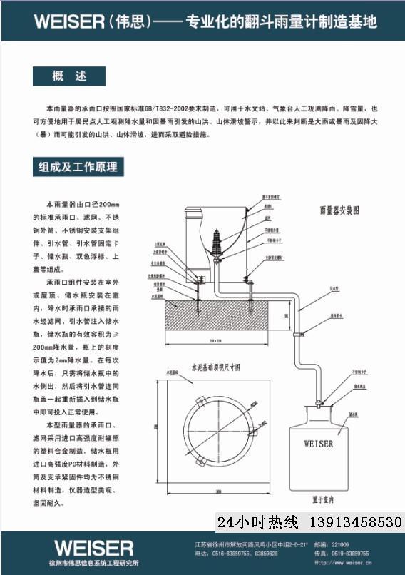 本雨量器是分辨力为1mm的人工观测式雨量器,它的承雨口组件安装在室外,储水瓶放置于室内,用于人工观测降水量,可方便地用于大雨、暴雨观测及可能发生的山洪、山体滑波警示。