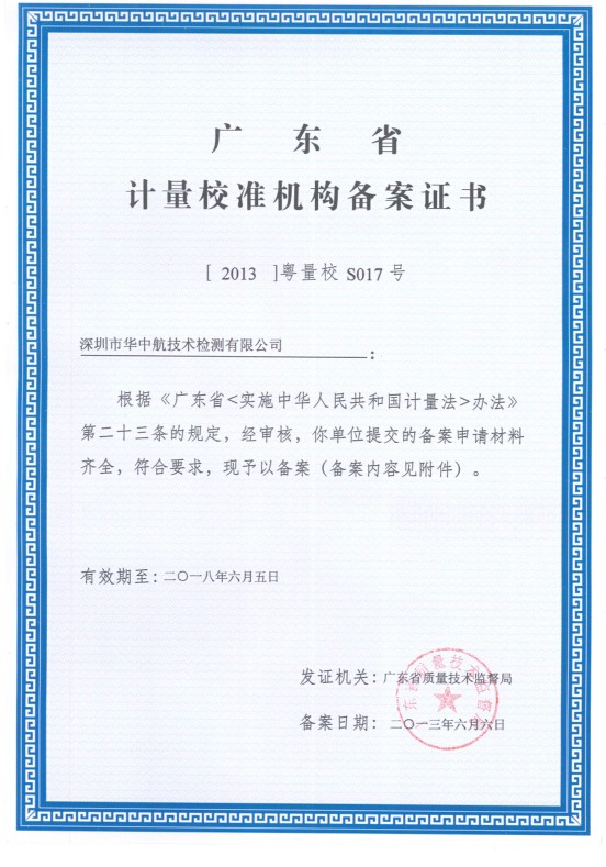 是深圳市政府依法注册的计量检定、校准的专业技术机构,以下简称“华中航实验室”。成立于2003年10月20日,始建于深圳市标志性建筑―――地王大厦,本着立足华南,面向全国,走向世界的发展战略,先后在深圳、东莞、惠州、中山、珠海等地设立了办事机构,服务于数万家企业,赢得了各领域的广泛赞誉,历经8年快速而稳健的发展,随着项目的增加和规模的壮大,于2011年7月迁至幽静的深圳市龙岗区布吉镇李朗大道深港中海信科技园第1栋A座第8层,建筑面积1700平方。
