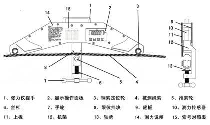 主要功能特点 具有张紧力的绳索结构,不需拆卸即可直接测量。重量轻、结构简单、操作方便,适用于任何场合。具有七种线径测量功能、测量范围更宽。使用范围:适用于柔性的,拉伸的索。如各种钢丝绳、高强度绳索等。精度等级:±3%~6%当被测索规格与测力仪中储存索号规格相同时,在额定量程内/测力精度可达±2%。(取决于绳索形式和特点)。