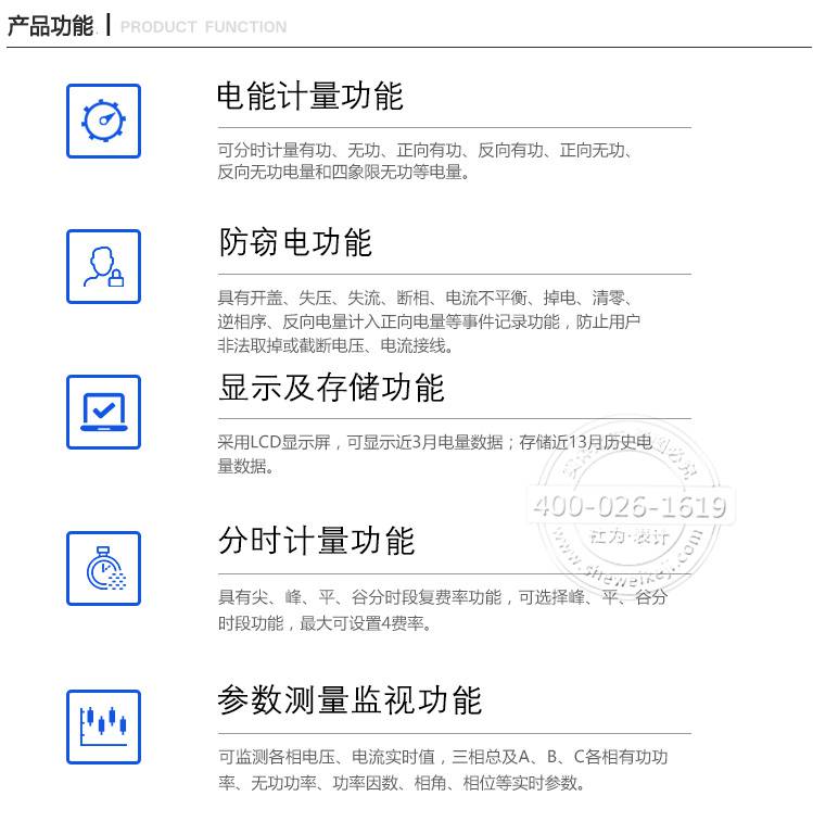 具有开盖、断相、逆相序、清零、反向电量计入正向电量等事件记录功能,防止用户非法取掉或截断电压、电流接线。
