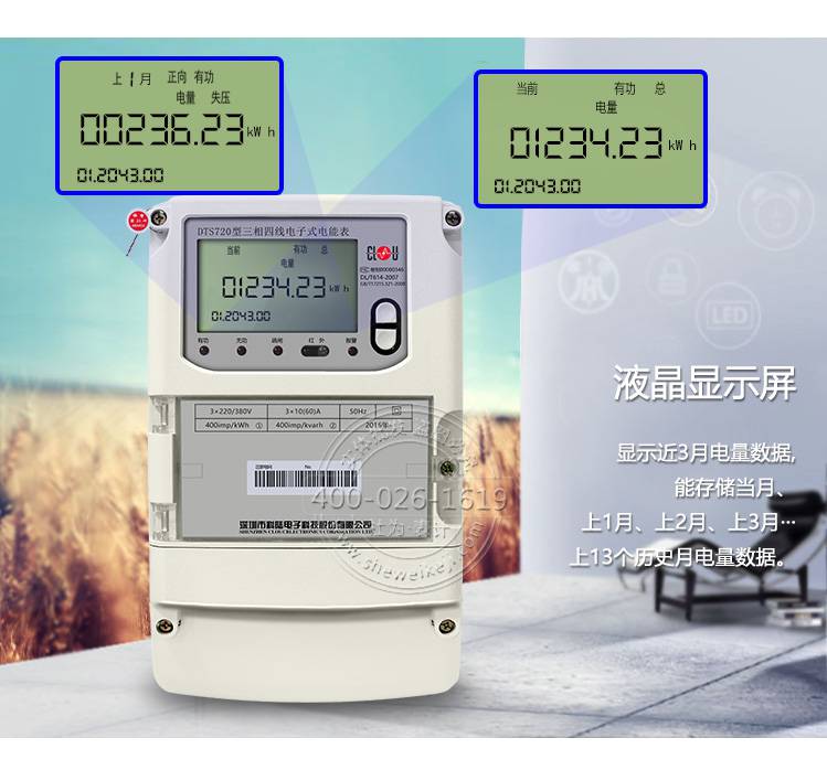 采用LCD显示近3月电量数据,可显示总电量及A、B、C分相电量。