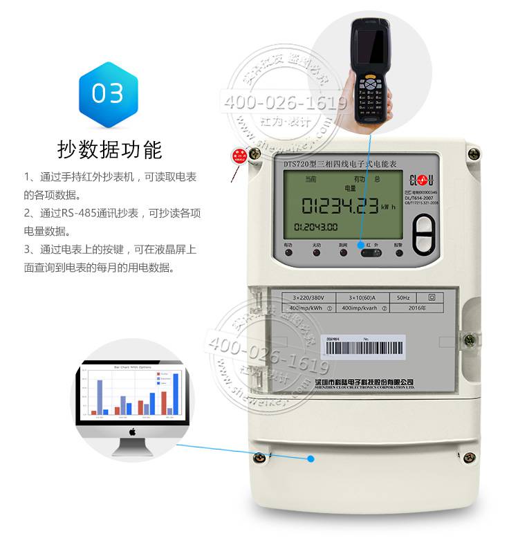 可通过按键、红外掌机及RS485通讯口抄表,配合抄表系统,可抄读电表的各项电量数据,支持DL/T645-1997多功能电能表通讯规约。