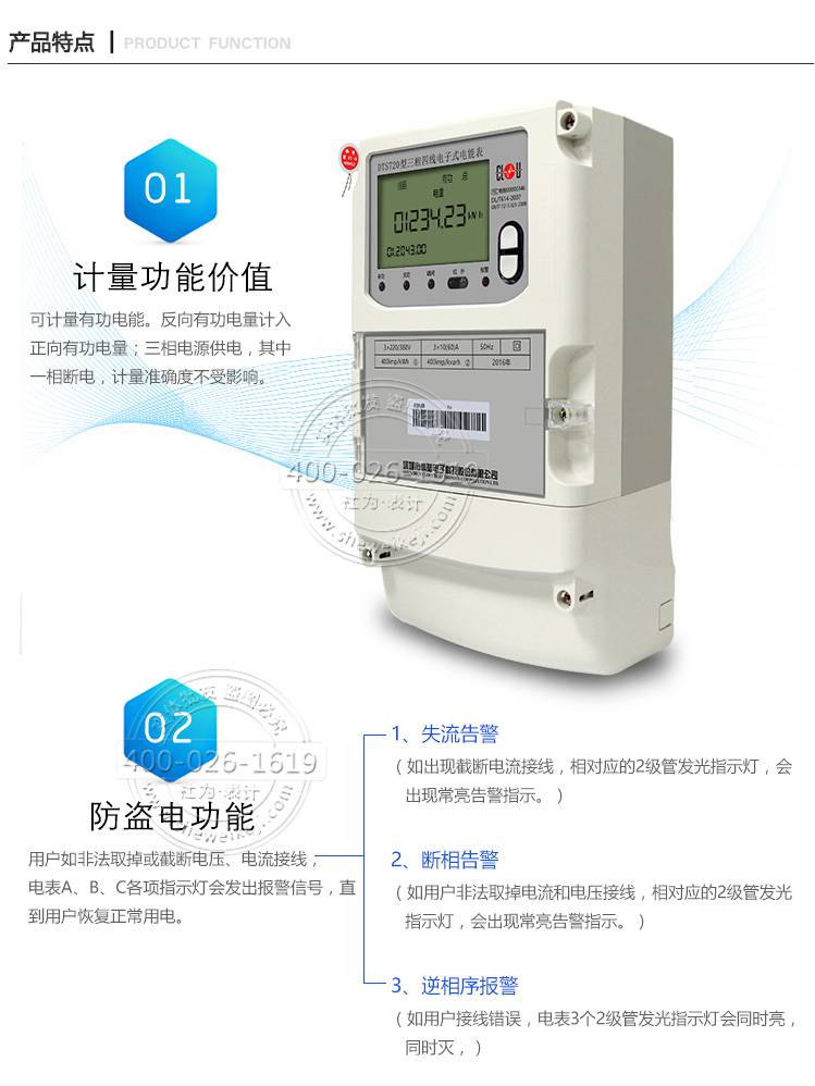 可计量有功电能,反向有功电量计入正向有功电量;三相电源供电,其中一相断电,计量准确度不受影响。