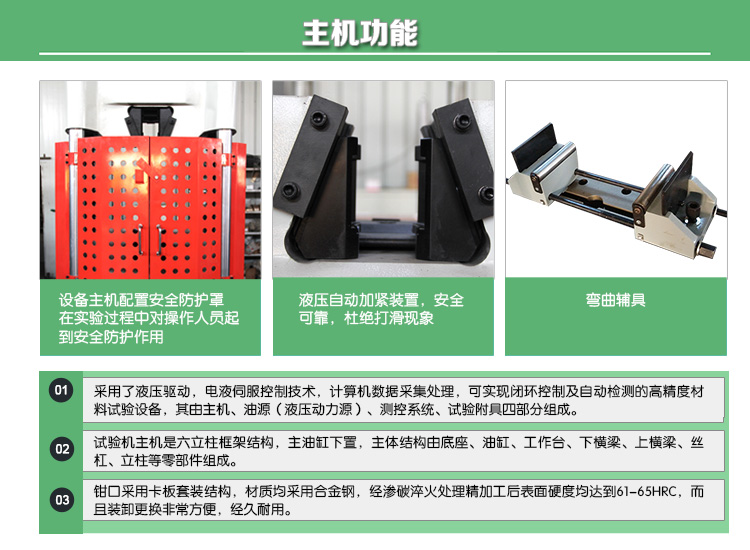 u 采用精度高的可插装调换式的圆试样夹具、扁试样夹具、上下压板,三点弯曲附具,均采用合金结构钢制作,表面硬度高,经久耐用,承载变形量小。