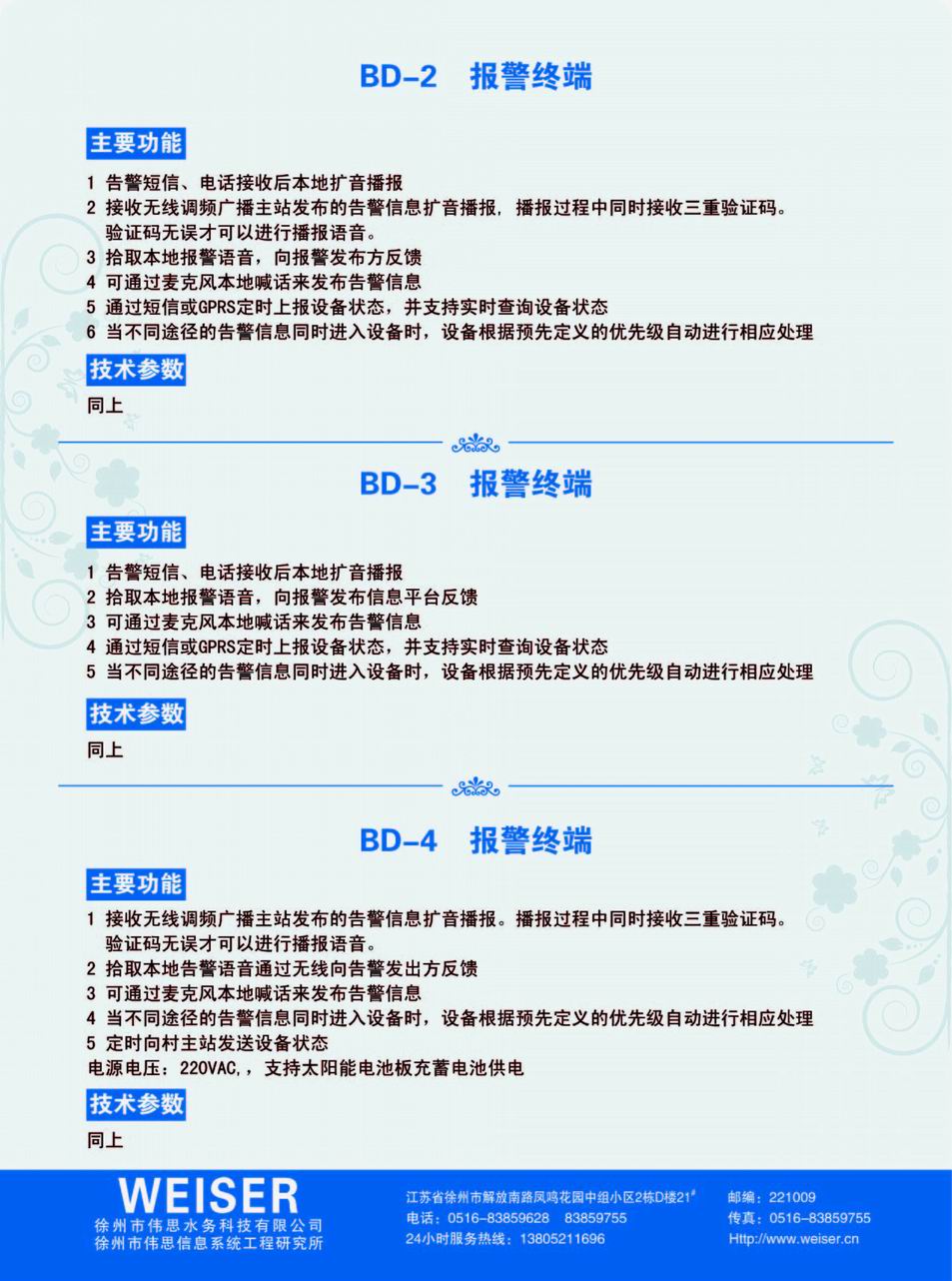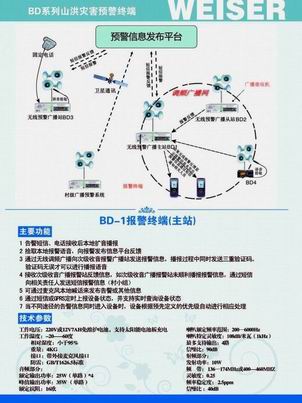 本灾害预警系统由灾害预警监视站与受警对象和监视中心组成。其中灾害预警监视点由自动(雨量、水位等)检测设备构成。由于跟水情测报设备比较价格低、小巧、可靠、安装方便、维护简单,又能满足(雨量、水位等)数据采集,便于大规模部防。受警对象通常是村、镇、县、市的管理人员,报警信息以短信方式送到相关手机上。监视中心通常可监视、管理一区域的灾害信息,它采用GPRS通讯作为管理设备运行,掌握设备工作情况。一个简单系统可不设监视中心以减少投资(或分步建设)。