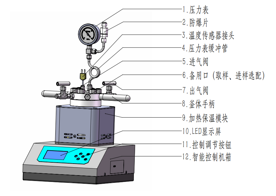 ※ 配件:进气阀、排气阀、液体采样阀、探底管、压力表、温度传感器、防爆膜、高温磁子等