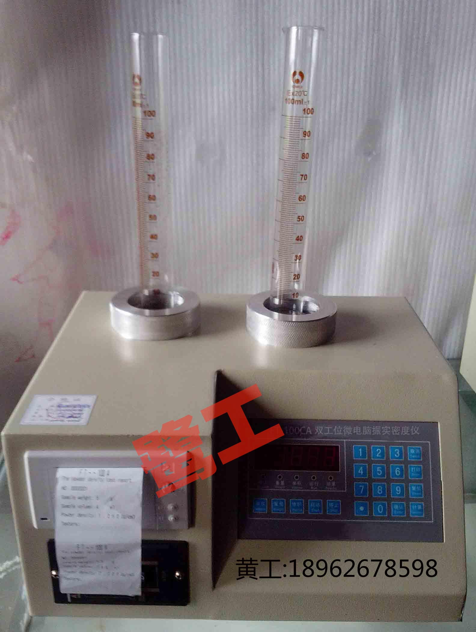 振实密度测试仪的基本工作过程是将粉末量筒固定在机械振动装置上,振动电机带动机械振动装置上下振动,装有粉末的刻度试管随机械振动装置而发生有节拍的振动,随着振动次数的增加,量筒里的粉末逐渐振实,振动次数达到设定的次数后,机械振动装置停止振动,读出刻度试管的体积,根据密度的定义:质量除以体积、从而求出振实后的粉末密度。