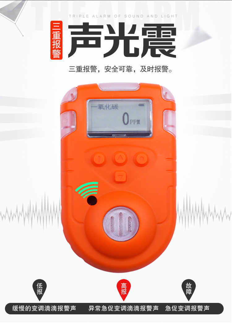 ◆ 报警系统:广角发光二极管、 85dB蜂鸣音随浓度增加频率加大、振动三重报警;