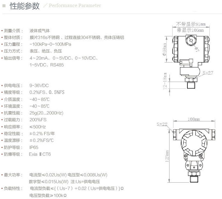 2088压力变送器主要参数指标:? 电源电压:10~36VDC,推荐24VDC。电源变化基本无影响。? 信号范围:电路板为±5mv~±80mv,对应到1.5mA扩散硅 传感器的输出最大可达320mv? 恒流激励:0.4mA,适合恒流供电的传感器(3~8kΩ)? 恒压激励:2.5VDC/0.5mA,适合陶瓷压阻传感器。? 采样速度:3~30次/秒可调,具有滤波系数可选择功能.? 显示方式:0.36寸高亮红色LED数码管。? 工作环境:温度-30~80℃,湿度<85%,干燥无腐环境? 外形尺寸:54*54*26。? 负载电阻:(VSS-10)/20mA。? 温漂系数:<35ppm/℃? 显示范围:-1999~9999。