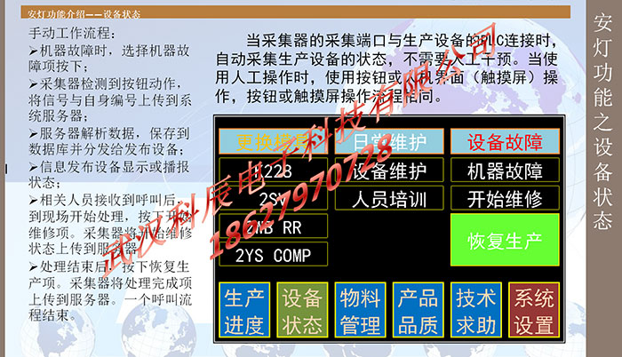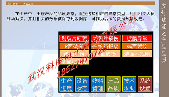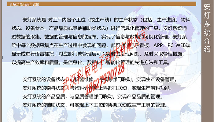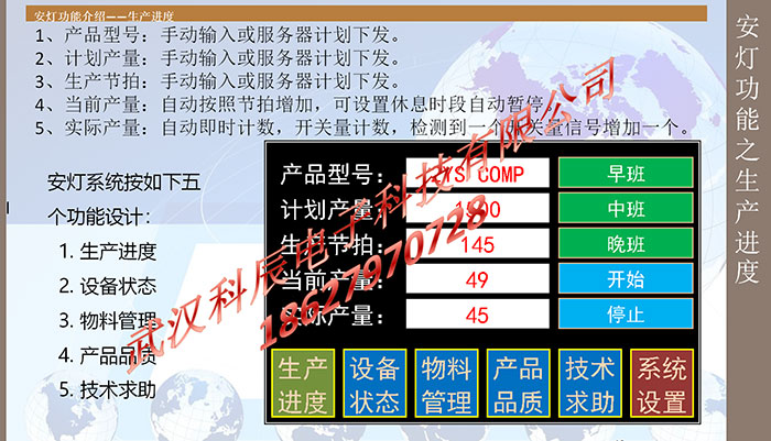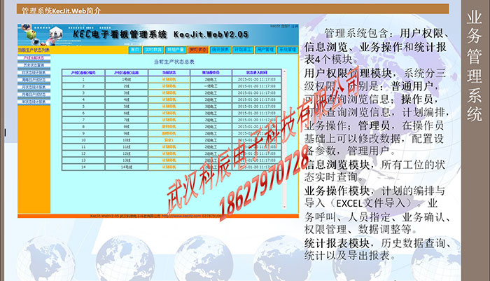 公司的电子生产看板系统(JIT系统),为自主研发生产全套软硬件系统,整个系统结构完整,整体性强,稳定可靠。系统对生产线上的硬件进行模块化管理,看板功能可以现场定义,即插即用,维护管理轻松方便。软件系统(软件名称:KecJit.Web)采用b/s结构,后台使用SQLServer数据库,可以在任何地方进行操作而不用安装任何专门的软件,客户端零维护,数据安全,系统的扩展非常容易,可以轻松实现用户在家即可同时查询和管理多个城市甚至在不同国家的多个工厂的生产。该系统在江西昌河汽车股份有限公司(景德镇工厂,整车生产)、武汉伟福工厂(日企,本田汽车底盘生产厂)、武汉高斯托普工厂(德企,奔驰、标志汽车底盘生产厂)、武汉顶益食品有限公司(康师傅集团)以及多个服装厂、帐篷厂安装使用,获得明显效益。
