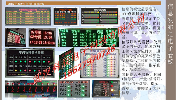 武汉科辰电子科技有限公司专业生产电子看板,生产看板,工业参数看板,工业参数采集器,工业参数显示屏,工业参数显示器,温湿度屏,日历温湿度屏,正负计时看板,酒店宾馆电子价格牌,油价牌,电子看板管理系统(JIT系统)。 我公司生产电子看板能与PLC组态软件MODBUS OPC直接通讯,可用遥控器扩展功能,按照客户要求订制,具有脱机和联网两种使用方式,性能稳定,功能强大。