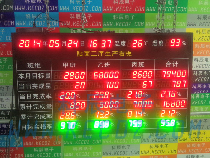 7.【其他功能】看板内置时段管理功能,可设置任意时刻暂停或启动,可设置自动清0或赋值(如每日生产前实际生产数自动清0,早中晚班计划数量自动切换等);看板上所有数据(除点阵上的文字)均可由现场遥控器修改;遥控设置的参数可以 保存,生产数据自动保存,断电不丢失;看板自带通讯功能,能与计算机双向通讯,上传现场生产数据或接收控制计算机下发的数据;能直接接入我公司配套的JIT管理系统(该系统需要另行收费,没有该系统或不启用通讯功能,电子看板以单机模式独立工作)。看板上所有的数据,均可通过计算机通讯控制
