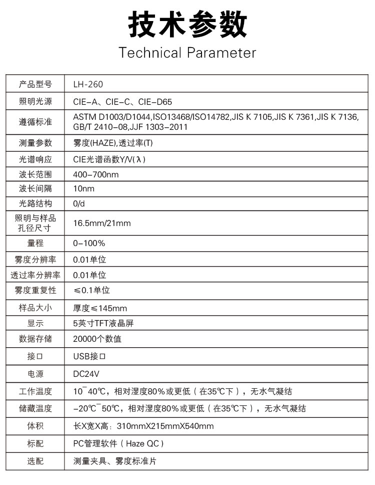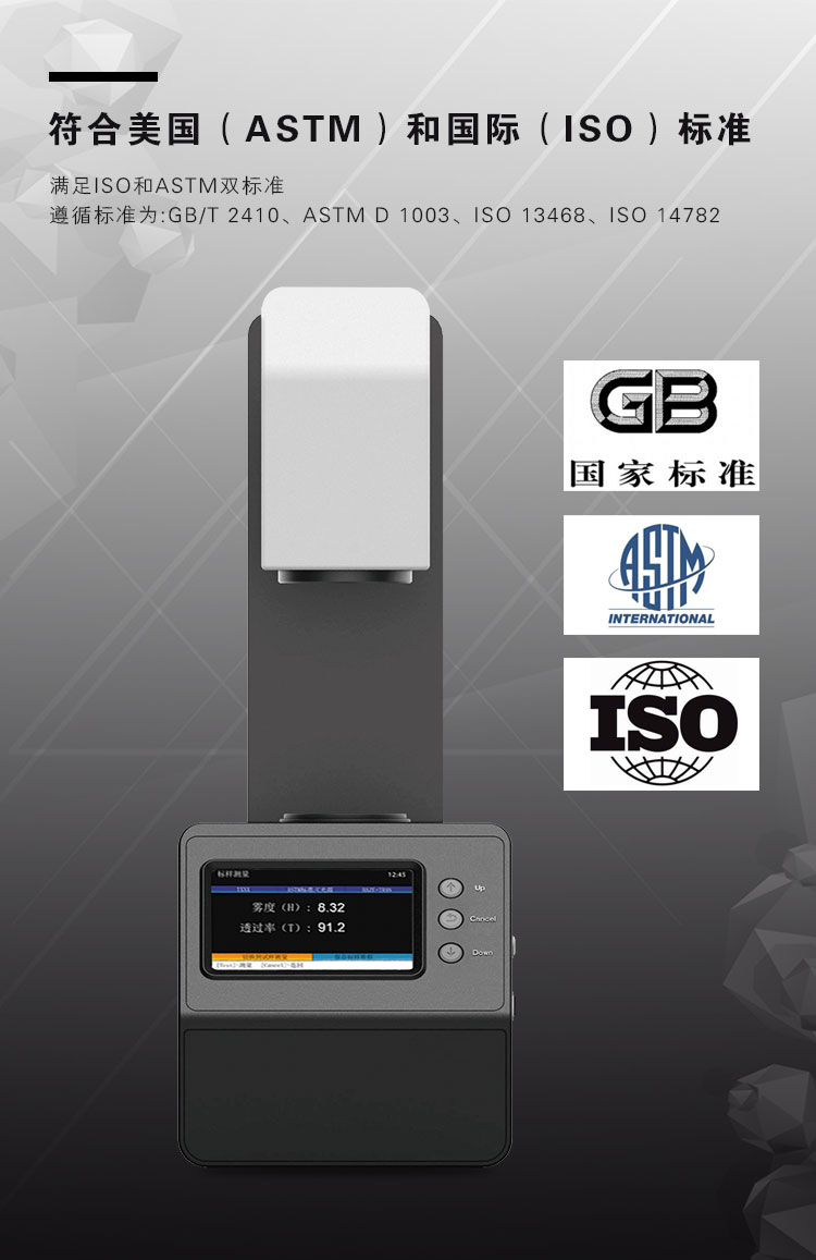 1. 雾度计符合以下测试标准:ASTM D1003/D1044,ISO 13468/ISO 14782,JIS K7105,JIS K 7361,JIS K 7136,GB/T 2410-2008。