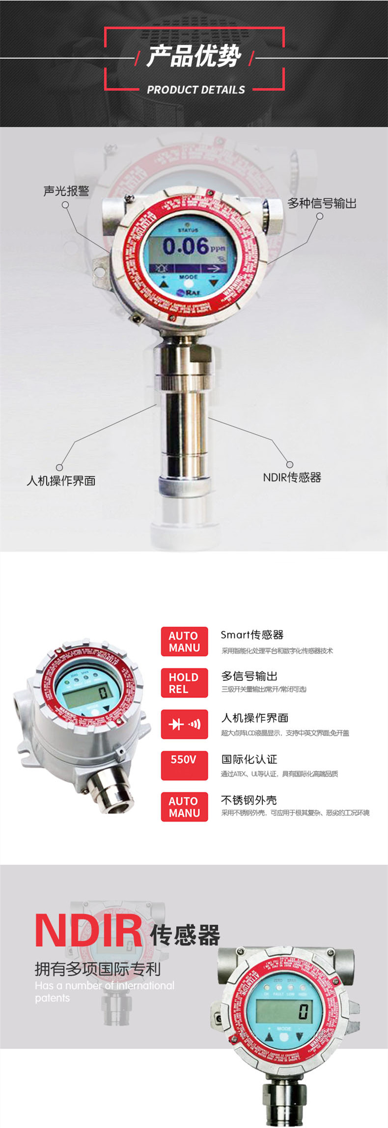 RAEGuards IR是一款隔爆型、采用智能数字化NDIR传感器检测技术、固定安装方式的气体检测仪。可广泛应用于石油、石化、冶金、化工、消防、燃气、环保、电力、通讯、造纸,印染、污水处理、食品酿造、科研、教育、国防等领域。
