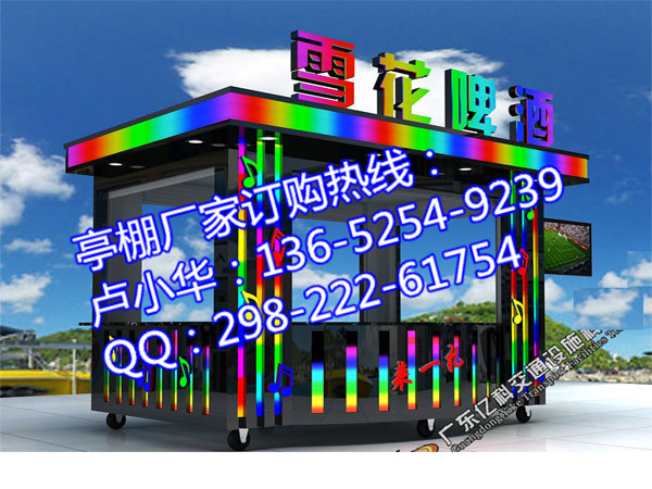 啤酒屋/啤酒亭一般设立在流量大的车站、码头、闹市、广场等地方,门面不需要太大,有六、七平方便可以了。亭内一般使用内部采用米黄色彩钢板贴防火阻燃板与内部方钢龙骨紧密连接,可让亭内整体感觉整洁大方;报刊亭墙体从内到外共有五层,完全符合售卖亭制作要求规范;而且内电器设备严格按照GB5226.1-2008标准设计,电器箱内部标配电度表、空气开关,亭内配有五孔插座、日光灯盘、开关;亭内所有线路套管在夹层中隐藏,此设计安全合理,检修方便;