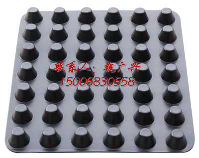 排水板;又凸型和方块名导水板,滤水板。分为;双面凹状。双面凹凸型是由高密度聚乙烯(HDPE)塑胶底板经过冲压制成圆锥突台或者加劲肋的凸点(或中空圆柱形多孔)而成主要规格有;H08,12,16,20,25,30毫米。圆锥突台的顶面胶接一层过滤土工布,以阻止泥土微粒通过,从而避免排水通道阻塞使孔道排水顺畅。 传统的排水方式使用砖石瓦块作为导滤层、使用较多的鹅卵石或碎石作为滤水层、将水排到指定地点。而用排水板取代鹅卵石滤水层来排水则省时、省力又节能、节省投资、还能降低建筑物的荷载。良好的排水系统对土建的施工周期及构筑物的正常使用和寿命具有重要的作用。排水板与多孔渗水管组成一个有效的疏排水系统,圆柱形的多空排水板与土工布也组成一个排水系统,从而形成一个具有渗水、贮水和排水功能的系统.