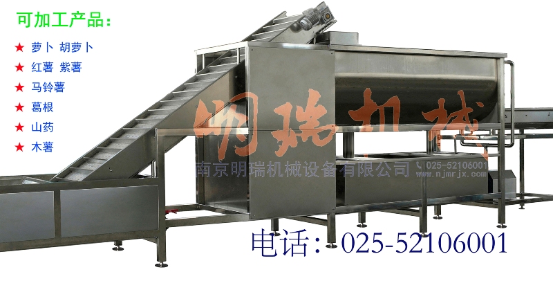 南京明瑞机械设备有限公司生产的SPQ-10型一体式薯类产品清洗机集浸泡、输送、毛辊刷洗、螺旋推进、强力冲洗、分选输送、出料喷淋等功能于一体,适合土豆、紫薯、地瓜、萝卜、红薯、胡萝卜、山药、葛根、木薯等薯类及根茎类产品去皮清洗。