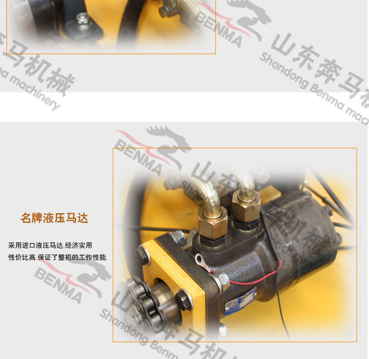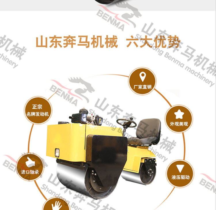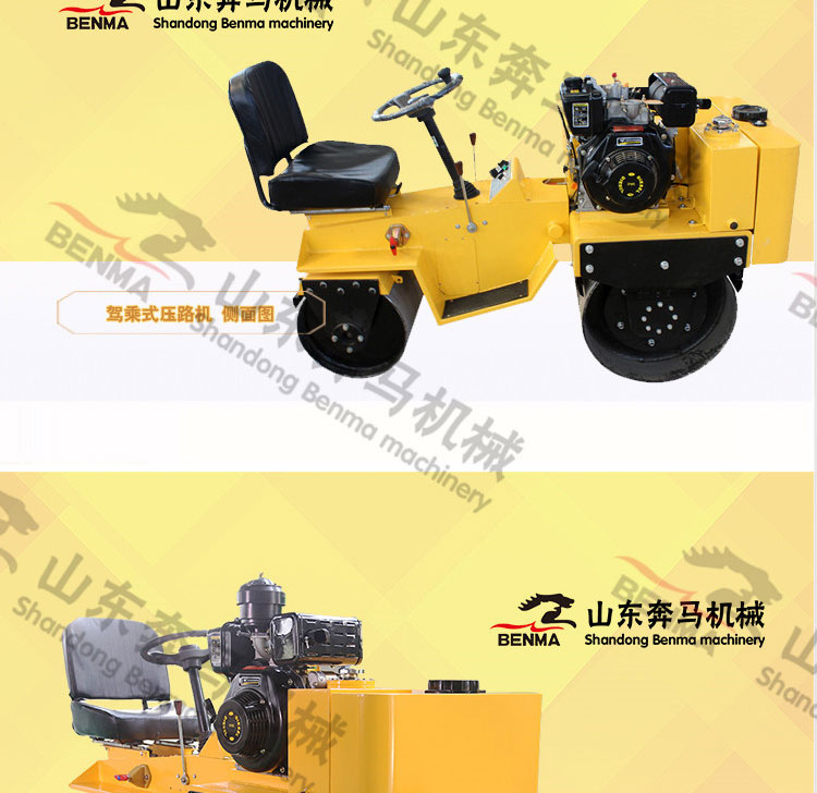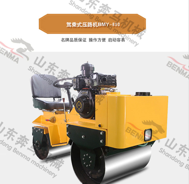 奔马座驾式850kg压路机(BMY-850型号),汽油款13马力,柴油款8马力,激振力25千牛,该款压路机配置美国进口怀特液压系统,性能好,静液压传动。