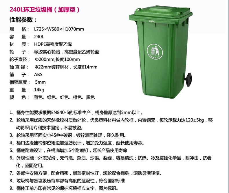 优点:全新原料,有效防止弱酸、弱碱的腐蚀。桶内光洁,减少垃圾残留,易于清洁。桶身、箱口及底部特别加固加厚处理,可经受各种外力部(如碰撞,提升及坠落等)。可相互套叠,方便运输,节省空间与费用。能在-30℃~65℃区间温度内正常使用。