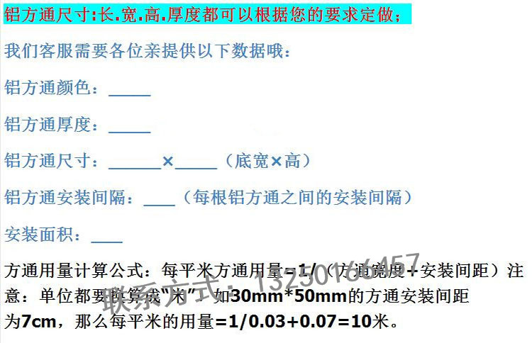 方通用量计算公式:每平米方通用量=1/(方通宽度 安装间距)注意:单位都要换算成“米”!如30mm*50mm的方通安装间距为7cm,那么每平米的用量=1/0.03 0.07=10米。