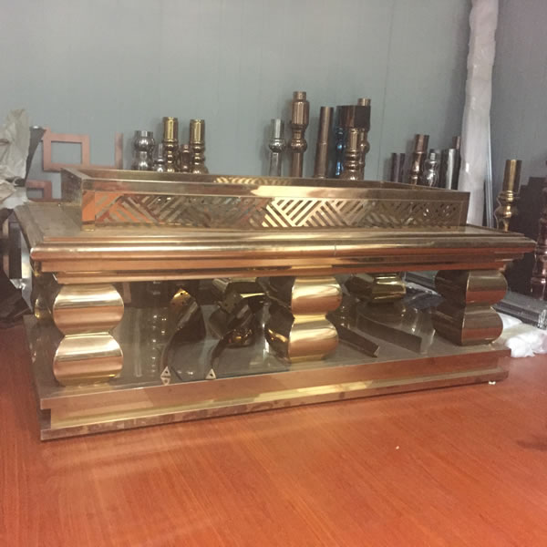 不锈钢茶几/桌子、公司业务范围:焊接加工、剪板、折弯、刨坑(刨槽)、卷圆、激光切割、承接各类不锈钢工程。 产品表面处理:镜面、拉丝、真空电镀彩色、蚀刻、无指纹等 真空电镀钛金颜色:黄钛金、玫瑰金、黑钛金、香槟金、宝石蓝、古铜色、紫色、灰色、青铜管、紫罗兰、玫瑰红等 我们拥有专业的工程设计人员,能快速为客户提供产品图纸设计及优化服务,能快速为客户提供详细的产品报价拥有有精湛的的加工技术以及高效的生产团队,可任意定制高端异形的不锈钢制品