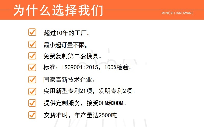 1. 工厂验货:100%检查外观和尺寸; 2. 可根据要求进行第三方检测。 |