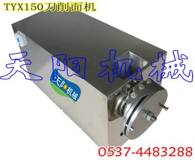 TYX-150型刀削面机结构新颖,设计合理,采用不锈钢包装,具有整洁美观,使用寿命长,安全卫生等优点,揉面刀削一气完成,完美再现山西刀削面的制作精髓,特有的二次揉面过程,解决了人工揉面、削面质量差的问题,使面筋纹路正好顺着刀削的方向形成,面条形状美观,中厚边薄,棱风分明,长短均匀,入口筋道滑爽,耐煮耐搁软而不粘,越嚼越香,美味诱人,因此削出的面条口感要优于手工刀削面。轻松实现刀削面生产标准化和机械化作业,提高工作效率和工作质量,适用于大中型食堂、饭店、宾馆及个体刀削面店使用。新款刀削面机使用220V/50HZ2.2 KW,外型尺寸650×220×270 (mm) ,削面速度5-6条/秒,5斤/分钟,削面宽度5-15mm可调,削面厚度1.5-4mm(可调节),价格2960元/台,配套设备拌面机价格1280元/台。