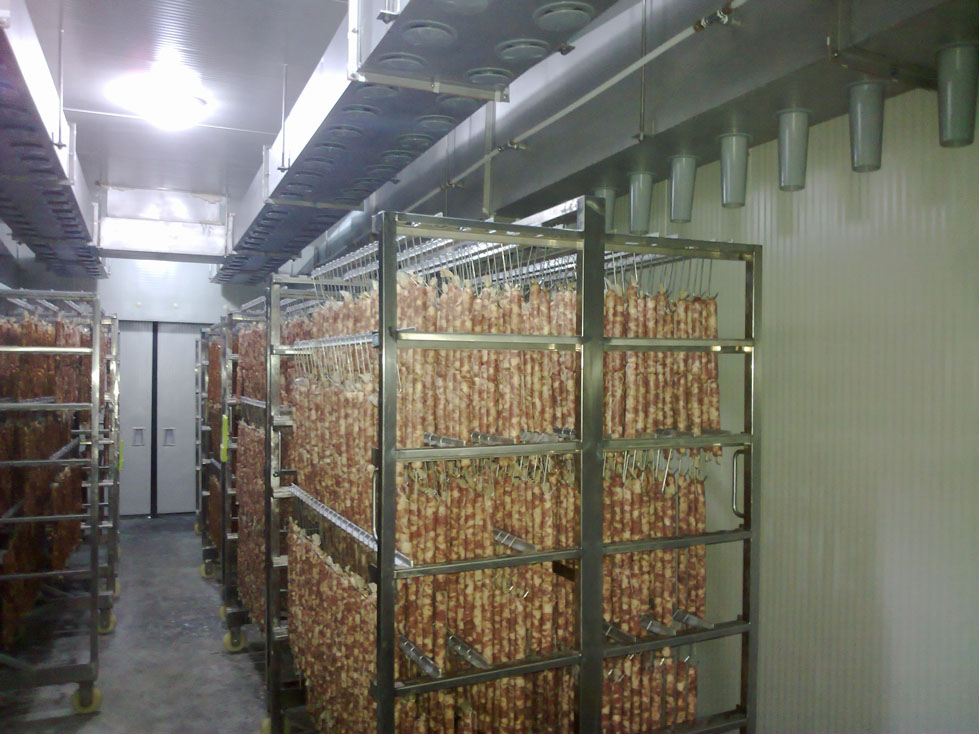-- 减速干燥阶段发色期和收缩定型期的控制,温度控制在50-55度之间,湿度控制在45%左右,时间为4-5个小时,腊肠逐渐从浅红色转为鲜红色,肠衣开始收缩,这时一定要注意硬壳的出现,可以进行冷热交替使用,效果更好。