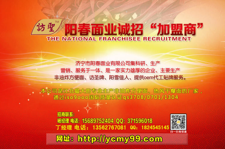 山东济宁素有“孔孟之乡、礼仪之邦”美誉,在这里,悠久的人文历史,繁荣的商业贸易,孕育出五彩纷呈的饮食文化,也正是在这百家争鸣般的饮食文化竞技中,在现代人挑剔的品味中,访圣速食蒸面以其独有的口感、完美的质量一马当先、独领风骚!