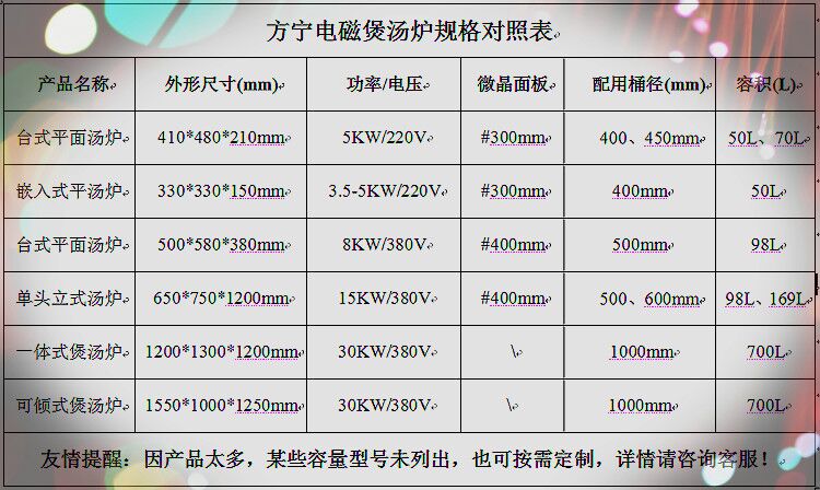 适用说明:采用先进的电磁感应加热技术,加热后可倾斜倒出,有防滑倾斜功能,方便安全,可精确控温。 广泛应用于各种类型食品加工业、宾馆、餐厅、工矿企业、机关部队、大专院校食堂,作为煮粥、熬汤、烧菜与炖肉之用。同时也适用于糖果、糕点、饮料果酱等食品加工及酿造、制酒、制药与日用化工等行业,作为物料溶化、消毒、加热、热烫、预煮、配制、蒸煮与浓缩之用。本产品是提高制品质量、缩短工作时间、改善劳动条件的首先食品设备。