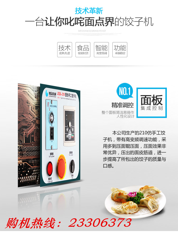 ◆本厂生产的210仿手工饺子机,带有高变频调速功能,采用多到压面辊压面,压面效果非常优异,压出的面皮筋道,进一步提高了所包出的饺子的质量与口感。