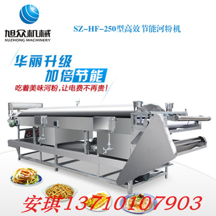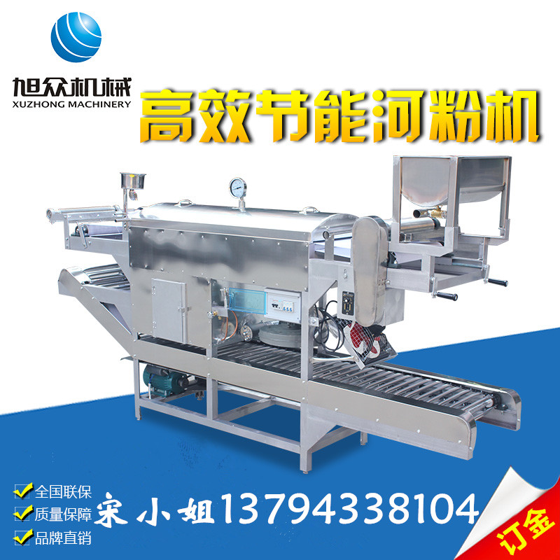 河粉机采用不锈钢材料精制而成;流线型外表,美观大方、经久耐用。直热式升温系统;升温快,低油耗,节能40%以上,微电脑控制;自动恒温;安全环保。机器的生产速度和产品的厚度都可自行调节。具有自动下浆、自动分条、操作简单;工艺先进。河粉机的工作大致是将磨好了的米浆自动输入河粉机中,然后通过河粉机蒸箱里面的热蒸气把它蒸熟成形,变成河粉,再切条冷却,变成食品,这样一个全自动化过程。