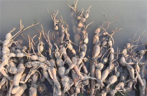 选择地势平坦、保水力强、近离水源、排灌方便田块,耕深25-30cm,耙平,蓄水5cm。每亩施厩肥6000斤,尿素40斤及钙镁磷肥100kg。定植时间4月10-4月30日。定植方式:行距3m,穴距2m。种藕藕支按10-200角度斜插入土,藕头入土深10cm,后把节梢翘露水面。各穴间在田间呈三角形对空排列。要求田块四周边行藕头全部向内,其内藕行分别从两边相对排放,至中间两条对行间的距离则加大至4.5m。分别于1-2片立叶期,封行前各追一次,每亩追施尿素30斤。水位调节:定植期水位5cm,5-6月5-10cm,7-8月15-20cm,9-10月5-10cm。除草:定植前,结合耕翻整地工作清除杂草;定植后至封行前,人工拔除杂草。7月20日采挖,每亩1000斤以上。