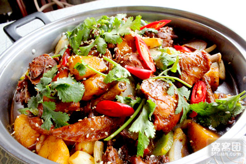 鸡公煲浓香滑嫩,入味彻底,特点麻辣鲜香,口感醇厚,香辛料味渗入鸡块中,食后令人回味无穷,口味可根据各地需要可调,分微辣、中辣、重辣各味型。