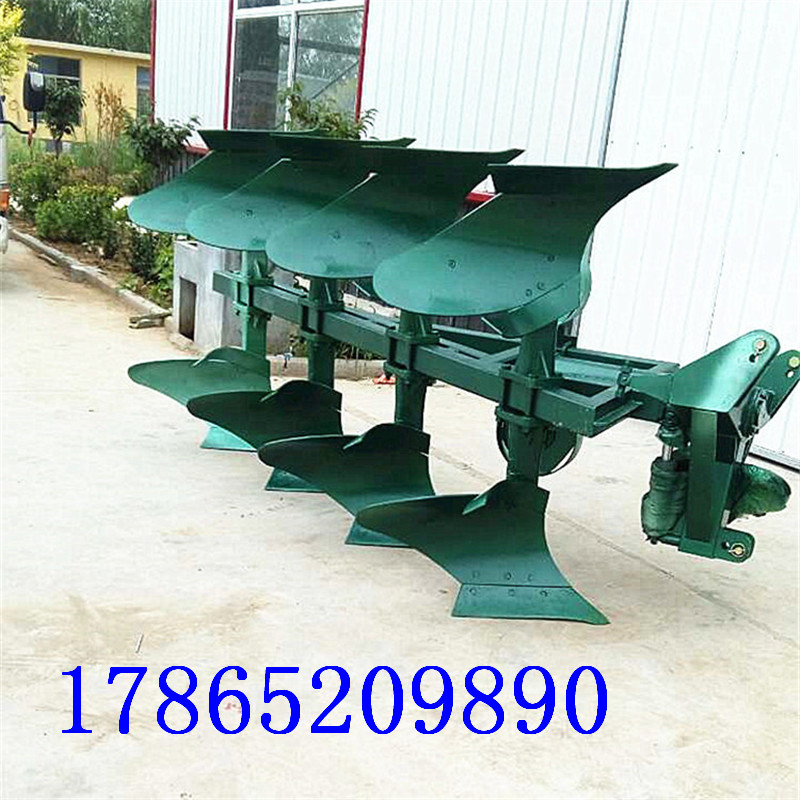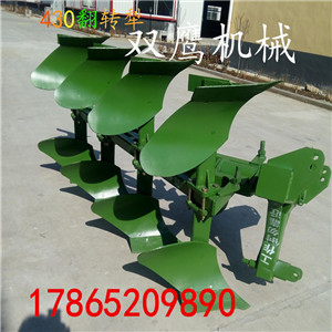 本犁是由犁前架、翻转机构、犁架、犁片构成;犁片共有对称的两组,立装在犁架上,犁架与犁前架由牵引轴相联;翻转机构是在牵引架上装有限位销、挂钩,牵引架和偏心悬臂用同一销钉装在犁前架上,并可转动,偏心调节杆的一端与偏心悬臂相联,另一端与犁架的一侧铰接,弹簧锁销装在犁前架的一侧,在犁架前部的两侧装有限位挡块与弹簧锁销相配合。本犁不论正反方向工作,均可使垄沟一致。