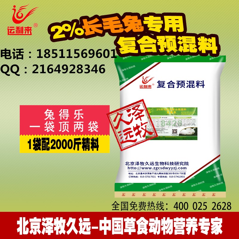 长毛兔因其毛密度高生长速度快,所以对营养元素的需求十分特殊,北京泽牧久远生物科技研究院根据长毛兔的生理特点及消化生理的特点专门研究了长毛兔专用的预混料,本院的2%长毛兔专用预混料--兔得乐有以下特点。