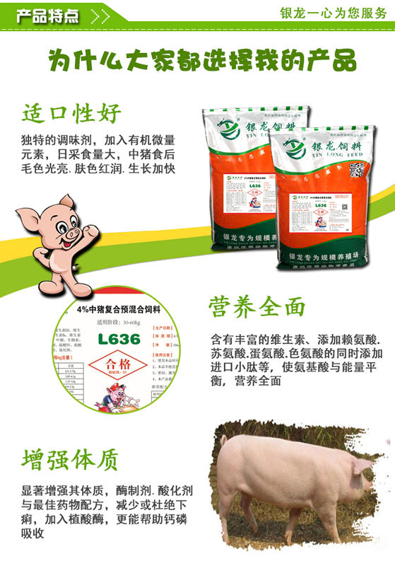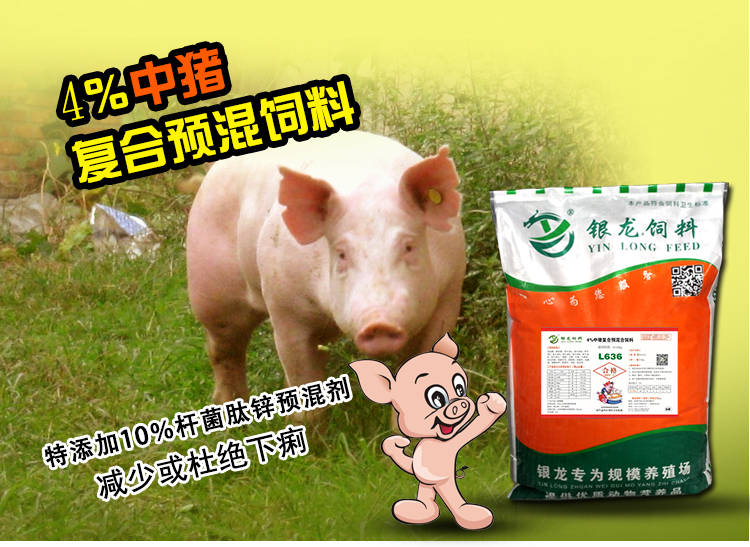 猪用复合预混料是由多种饲料添加剂按照一定的配比混合而成的中间产品,旨在让用户自行配制全价饲料。我国技术监督局发布的《饲料工业通用术语》标准中对饲料添加剂如下定义:“为满足畜禽特殊需要(如为提高饲料利用率,保证或改善饲料品质,促进饲养动物生产,保障饲养动物健康)而加入饲料中的少量或微量营养性或非营养性的物质。 中猪预混料L636 产品特点:本品强化了B族维生素,合理的钙磷比例,培养中猪良好体型;高效的氨基酸和复合酶制剂技术,使猪生长速度快,饲料报酬低。此段料肉比2.0-2.4:1。 适用阶段 玉米 麸皮 豆粕 鱼粉 L636 30-60kg 66 10 15 3 4 注意事项:使用本品时应充分搅拌均匀,切勿蒸煮。 保质期:6个月