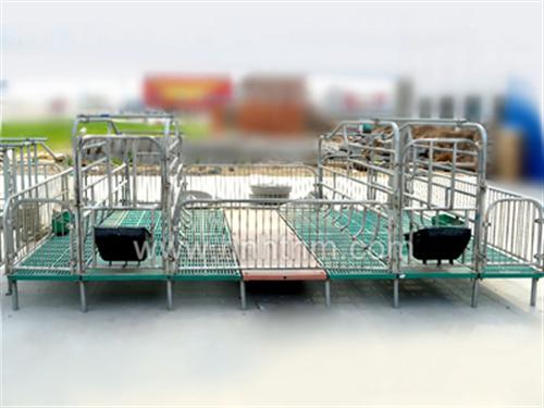 母猪产床的用法。适用于母猪分娩和哺育仔猪使用,采用高床饲养,网上产仔,常用的网上形式有钢编网、钢塑网、全铸铁网、铁塑混合网。当前的主流是母猪位铸铁、仔猪位塑料的混合板形式。仔猪在干净舒适的塑料地板上饲养,冬暖夏凉,提高了仔猪成活率以及小猪的饲养质量。复合漏粪地板及电热板可以防止冬季仔猪痢疾等疾病,同时有利于分辨粪方落入粪池,也可减少猪群因粪便污染导致的疾病,复合漏粪板抗腐蚀性强,延长使用寿命。围栏整体热镀锌,耐腐蚀,表面光滑,不会划伤猪管2.0厚。结构设计合理,在母猪分娩时具有良好的分娩空间以及发生难产时有利于人工助铲。