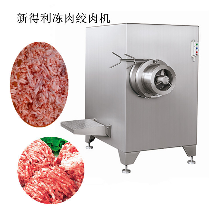 绞肉机工作时利用转动的切刀刃和孔板上孔眼刃形成的剪切作用将原料肉切碎,并在螺杆挤压力的作用下,将原料不断排出机外。可根据物料性质和加工要求的不同,配置相应的刀具和孔板,即可加工出不同尺寸的颗粒,以满足下道工序的工艺要求。