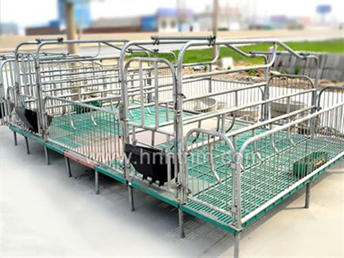 母猪产床其中一侧是固定的,另一侧的前支脚可以自由转动,可以完全打开,这样的设计便于产房内母猪在通道和产床之间自由进出,这种设计特点也使得产床的宽度是可调节的,可根据母猪身形在55-63CM之间进行调节,从而对母猪产下的仔猪也起到了保护作用,产床的长度也可根据后方闸门的位置在165-195CM之间变化,这种产床标准的这种新型产床由镀锌钢管、不锈钢食槽组成,根据各主场的要求,可定制各种型号的饮水器。
