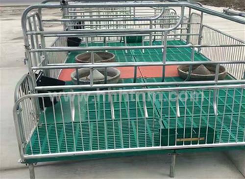 母猪产床其中一侧是固定的,另一侧的前支脚可以自由转动,可以完全打开,这样的设计便于产房内母猪在通道和产床之间自由进出,这种设计特点也使得产床的宽度是可调节的,可根据母猪身形在55-63CM之间进行调节,从而对母猪产下的仔猪也起到了保护作用,产床的长度也可根据后方闸门的位置在165-195CM之间变化,这种产床标准的这种新型产床由镀锌钢管、不锈钢食槽组成,根据各主场的要求,可定制各种型号的饮水器。