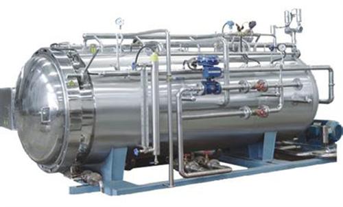 卧式压力杀菌锅一般多用于加压杀菌,适用于大中规模罐头生产。卧式杀菌釜的罐头装卸是利用手推车,将装有已密封罐头的谊(篮)推人杀菌釜内或从杀菌釜中卸出。杀菌釜一般都安装在地面上,大型装置安装时可于地面20~30cm,使杀菌釜内的导轨与地面高度相同,以便于使手推车出入方便。有些杀菌釜两端开门,一边进,一边出,便于流水作业。