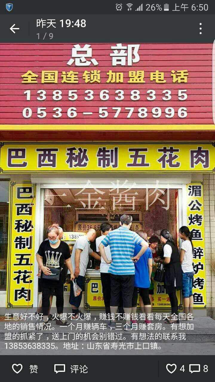 巴西秘制五花肉【嘿】巴西秘制五花肉加盟【嘿】巴西秘制五花肉加盟总部巴西秘制五花肉是三金餐饮在巴西烤肉的基础上研发的产品,以口感鲜香,色泽红润,肉质细嫩,外酥里嫩,肥而不腻的特色迅速火爆全国,更以巨大的利润给加盟者创造商机。现在全国大部分地区还是空白,抓住先机,抢占市场。利润分析:一条成本13元,卖25元,纯利润12元,一天卖200条纯赚2400元,一个月72000元。利润空间非常大,蛋糕店,熟食店,及各种店铺都可以做,投资小见效快。现特价优惠:加盟费3800元,包教包会,100%核心机密配方完全公开无保留。自己从当地购买就行,无需总部提供。以前来学过其他系列产品的学员优惠2000,只收1800元。使用三金酱肉品牌的加盟店可以免费来学。(想学三金酱肉其他系列产品的可以百度三金酱肉)另外免费赠送湄公烤鱼、啤酒烤鸡、啤酒烤鸭技术配方我们有实体店,学员现场操作,包教包会学会为止,可以来实地考察,满意再学。没有实体店的加盟机构,餐饮公司,奉劝大家三思而后行。地址:山东省寿光市上口镇电话/微信:13853638335QQ:3157534127有学员学习过程视频和详细说明可以先看看了解一下
