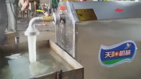 这条生产线可一次性完成糊化熟制、成型切条等工序,操作者只要按配比倒入面浆,按下按钮就只等热乎的凉皮出来了。