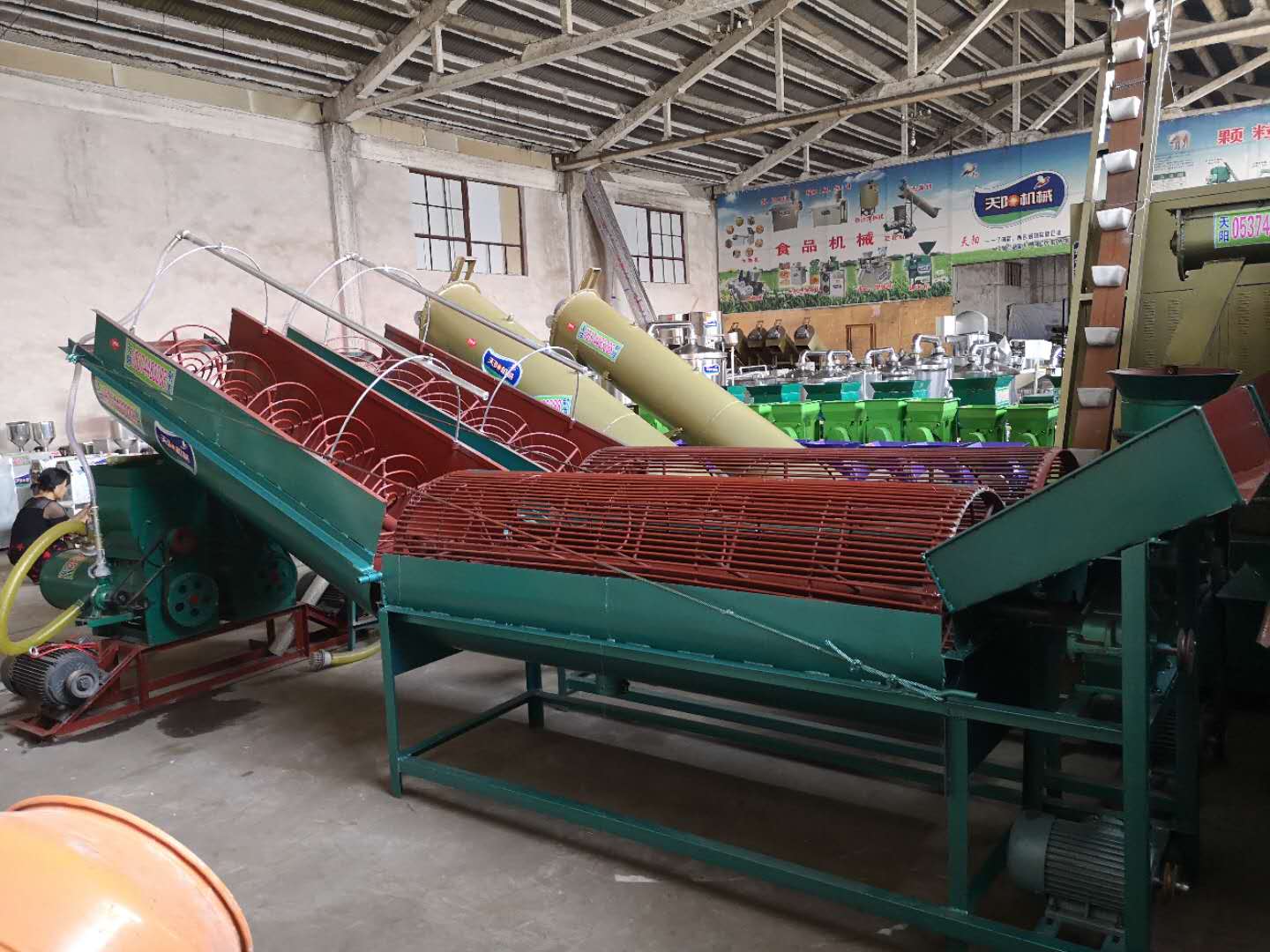 天阳一体式红薯淀粉机组是综合国内外制粉设备,根据薯藕特性专门设计的淀粉加工设备,主要由转笼洗薯机,斜式螺旋送料机,鲜薯刨丝破碎机、浆渣分离淀粉过滤装置,给水装置组成,自动进料,破碎分离,排渣,省时省工,能够一次完成薯类泥沙清洗、刨丝破碎、自动过箩、浆渣粉离等工序。天阳转笼清洗上料机动力小,上料方便,处理量大,清洗干净彻底,克服了人工清洗上料,产量低、劳动强度高的缺点,减轻了体力劳动,可广泛应用于红薯、马铃薯、莲藕、蕉藕、葛根、萝卜等块状茎原料的清洗。使用时薯藕由料斗缓缓洗薯机转笼内,通过转笼缓慢运行,清水浸泡,薯藕等在旋筒中一方面沿筒壁作圆周运动,一方面沿轴线作直线运动,加长了清洗距离,薯藕洗净度高,并可部分去皮。泥沙、石块、皮渣通过壳底排污口自动排出,洗好的薯藕再经螺旋上料机输送到出料口进入淀粉机中粉碎加工即可。