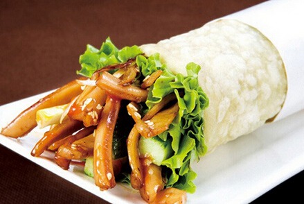 第八步,主要系统学习如何将烙好的薄饼卷成漂亮的卤肉卷。这里重点学习刷酱、主菜搭配、卷饼手法、技巧等知识。