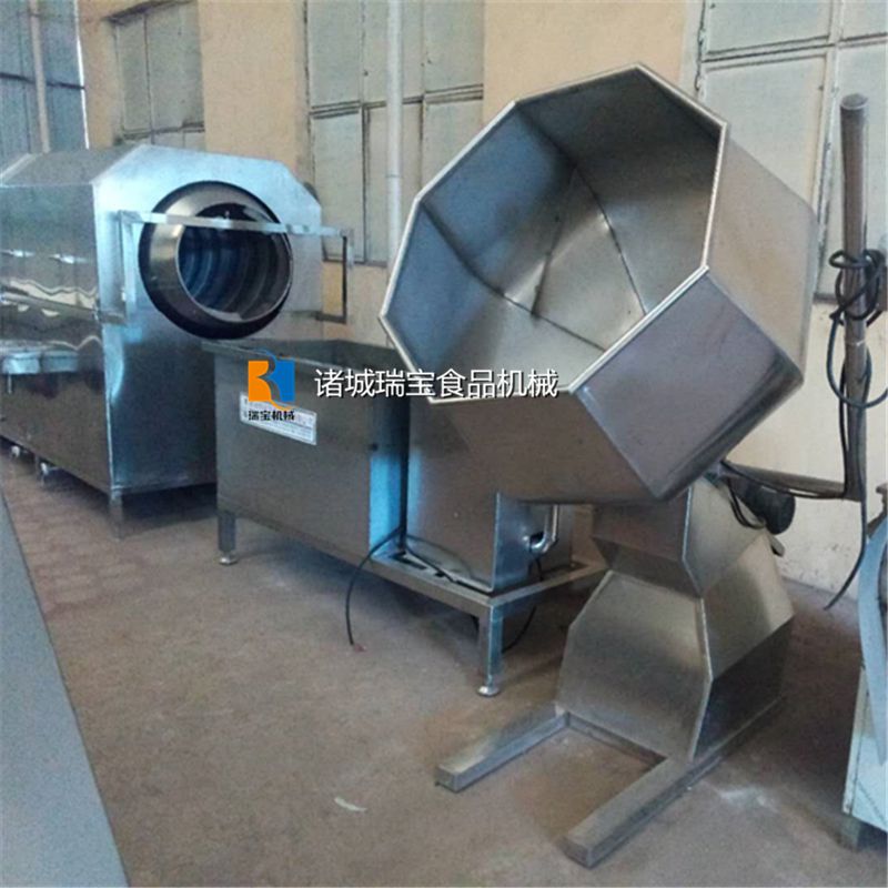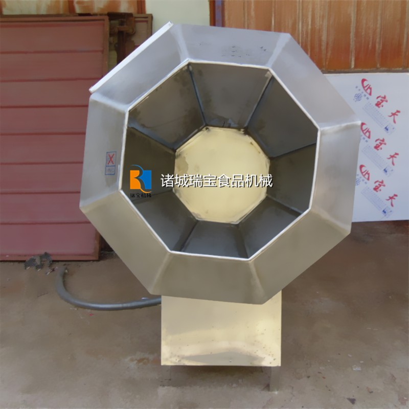 我公司生产的八角调味机桶体设计为八角型,是一种将多种物料在一起混合旋转搅拌的设备,适用于食品生产过程中对块状.片状.颗粒状食品的上粉和拌料,避免了圆球调味桶原料不翻动的弊端,能在较短时间内使待加工食品物料与所需调料充分拌合均匀,自动倾斜把食品物料送出筒外,达到自动拌匀,自动出料之目的,使用方便。球体为不锈钢材料。此设备适用于各种膨化食品,如薯条.薯片等,该调味机在膨化食品调味中占有不可或缺的作用具有能够更好的大量生产的优点。